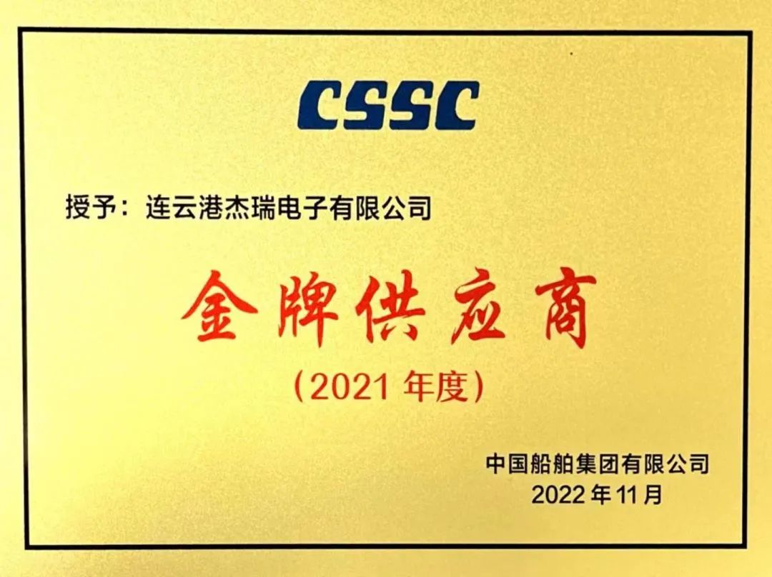 近日,中國船舶集團有限公司“2022現代供應鏈建設(供應商)大會”在上海成功召開。中國海防子公司連雲港傑瑞電子有限公司繼2020年榮獲“金牌供應商”榮譽稱號後,再創輝煌,在本次大會上蟬聯該榮譽。“金牌供應商”是中國船舶集團有限公司對其供應商最高形式的獎勵,充分體現了集團公司對傑瑞電子綜合實力和服務能力的高度認可!