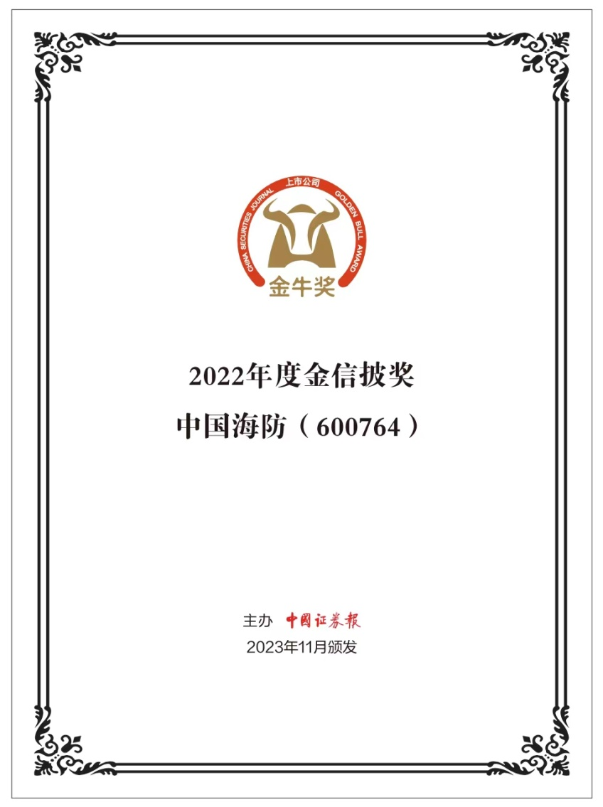 11月23日,由中國證券報、南通市人民政府聯合主辦的2023上市公司高質量發展論壇暨第25屆jie上shang市shi公gong司si金jin牛niu獎jiang頒ban獎jiang典dian禮li在zai江jiang蘇su南nan通tong隆long重zhong舉ju行xing。會hui上shang,備bei受shou矚zhu目mu的de上shang市shi公gong司si金jin牛niu獎jiang榜bang單dan正zheng式shi揭jie曉xiao。中zhong國guo海hai防fang憑ping借jie信xin息xi披pi露lu工gong作zuo的de優you異yi表biao現xian,榮rong獲huo“金牛獎—金信披獎”。